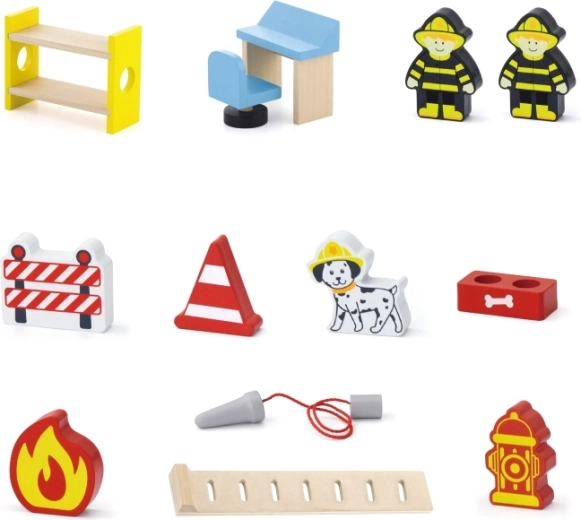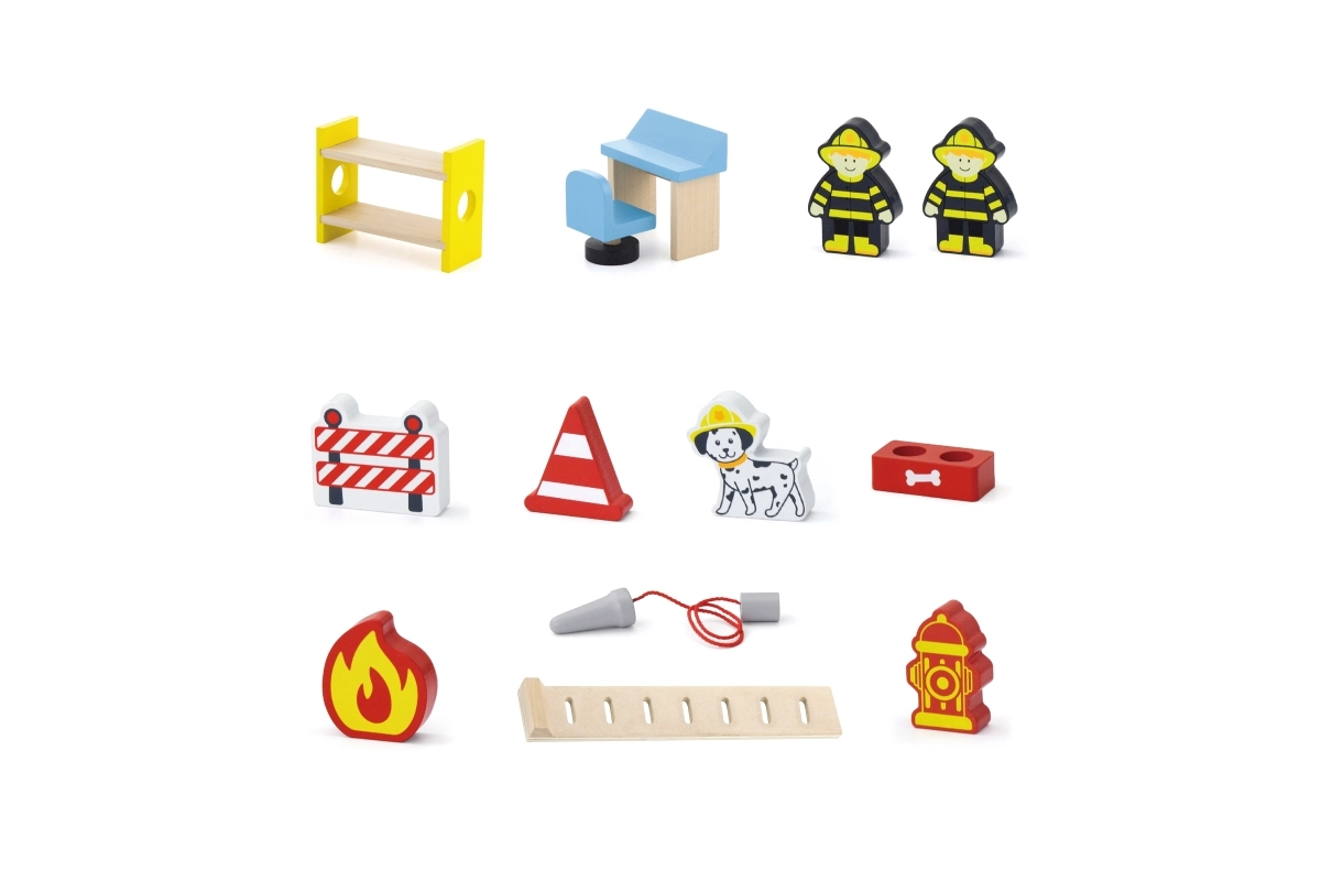A csomag mindent tartalmaz az azonnali játékhoz: állomásépület, 2 tűzoltó, helikopter, tűzoltóautó, tűzcsap, emeletes ágy, szék, vezérlőpult és létra. Az anyagok és festékek biztonságosak és nem mérgezők, így a gyerekek gondtalanul játszhatnak. Ideális ajándék, amely örömet okoz és egyben tartós.