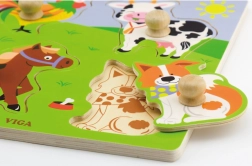 Fedezze fel az első kirakót, amely játékos módon tanítja a gyerekeket a formák és a tanyasi állatok felismerésére. A minőségi fa tábla színes illusztrációkkal és masszív, fogantyús elemekkel ideális a kis kezekhez és a mindennapos játékhoz.
