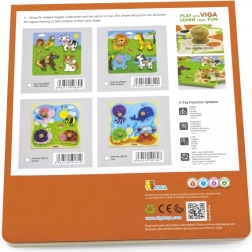 A gyerekek játékosan megtanulják felismerni a háziállatokat, mint például a kutyát, lovat, tehenet vagy a kakast. A kontrasztos színek fenntartják a figyelmet és támogatják a vizuális érzékelést.