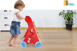 A szélesen álló, gumiborítású kerekek védik a padlót és növelik a stabilitást, a fa fogantyú jól illeszkedik a gyermek kezébe. A termék lakkozott fából készült, a lakok és festékek megfelelnek az EN71 és ASTM szabványoknak. Ideális otthoni eszköz a motorika, a türelem és a fantázia fejlesztéséhez.