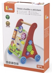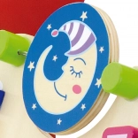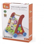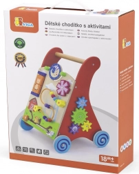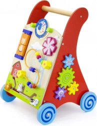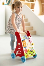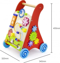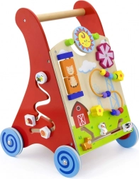 Ez a minőségi, fából készült járássegítő aktivitási központtal ötvözi a járástámogatást a gazdag szenzoros ingerekkel. Az elülső panel forgó elemeket kínál nappal és holddal, forgó szélforgót, ötgyöngyös motorikus hurkot, forgótárcsát cicával, valamint csúszkáló állatkákat (tehén, kutya, ló), melyek pályán haladnak az istálló felé. Az oldalsó részeket fogaskerekek és egy pálya méhecskével, katicával és csigával egészítik ki.