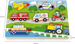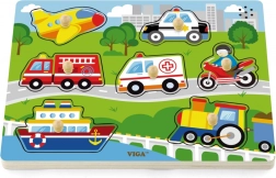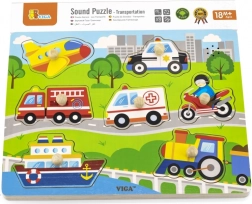 A puzzle a következő közlekedési eszközöket tartalmazza: repülőgép, autó, mentő, hajó, tűzoltóautó, motorkerékpár és helikopter. A gyerekek figyelme és memóriája gyorsan javul a játék során. Ajánlott 18 hónapos kortól.