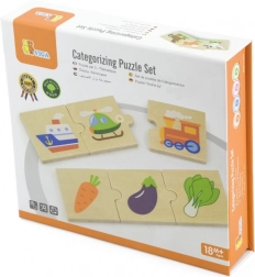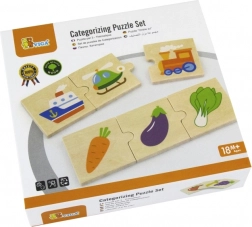 A VIGA fa logikai kirakó játékosan kapcsolja össze a szórakozást és a tanulást. A gyerekek 24 elemet illesztenek 8 értelmes hármassá – például három állat, három közlekedési eszköz vagy háromféle zöldség. Így természetes módon gyakorolják a kategóriák felismerését, a koncentrációt és a szókincset.