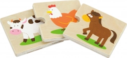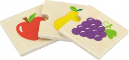 Minden elem masszív fából készült, sima élekkel és élénk, színes illusztrációkkal, amelyek támogatják a vizuális észlelést és motiválnak a további felfedezésre. A készlet otthoni játékra és óvodai használatra egyaránt alkalmas – kiválóan illeszkedik a rendezés, megnevezés és közös feladatmegoldás jellegű tevékenységekhez.