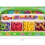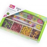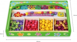 Ez a fa gyöngykészlet órákon át tartó szórakozást nyújt a gyerekeknek egyedi nyakláncok és karkötők készítése közben. A dobozban különböző alakú és méretű, színes gyöngyök, virágos díszek és zsinórok találhatók az egyszerű fűzéshez. Az áttekinthető rekeszeknek köszönhetően a gyöngyválasztás könnyű, a kreatív alkotás pedig természetes módon támogatja a koncentrációt és az önkifejezést.