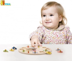 Minden elem fa gombbal rendelkezik a kényelmes megfogáshoz. A kirakás közben a gyerekek gyakorolják a finommotorikát és a szem–kéz koordinációt.