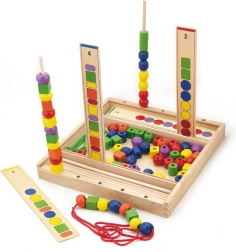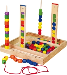 A gyerekek a kártyák által meghatározott sorrendben helyezik fel és fűzik a gyöngyöket a pálcákra. Fejlesztik a szem–kéz koordinációt, a türelmet, valamint a színek és formák felismerését.