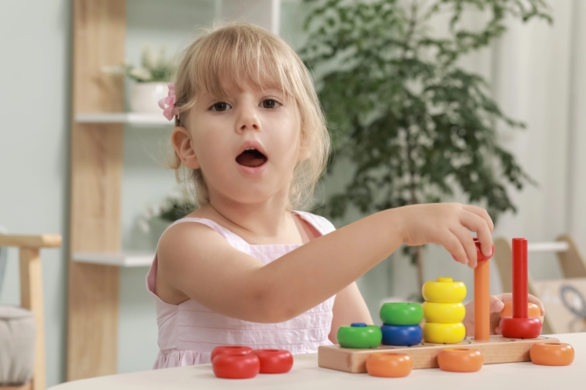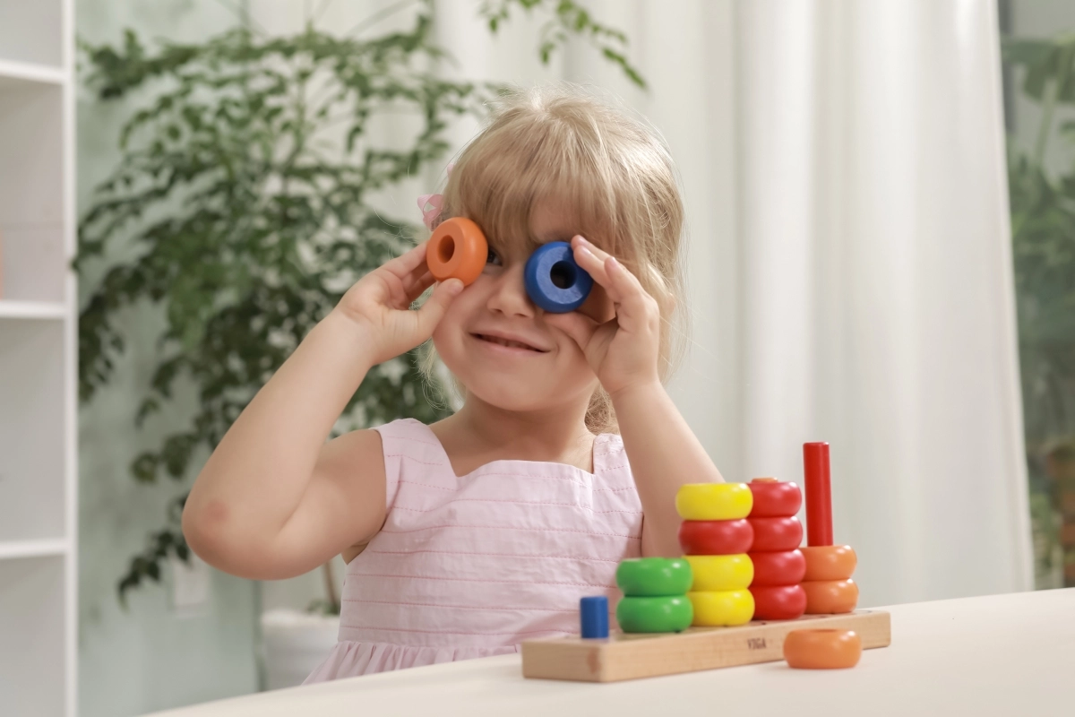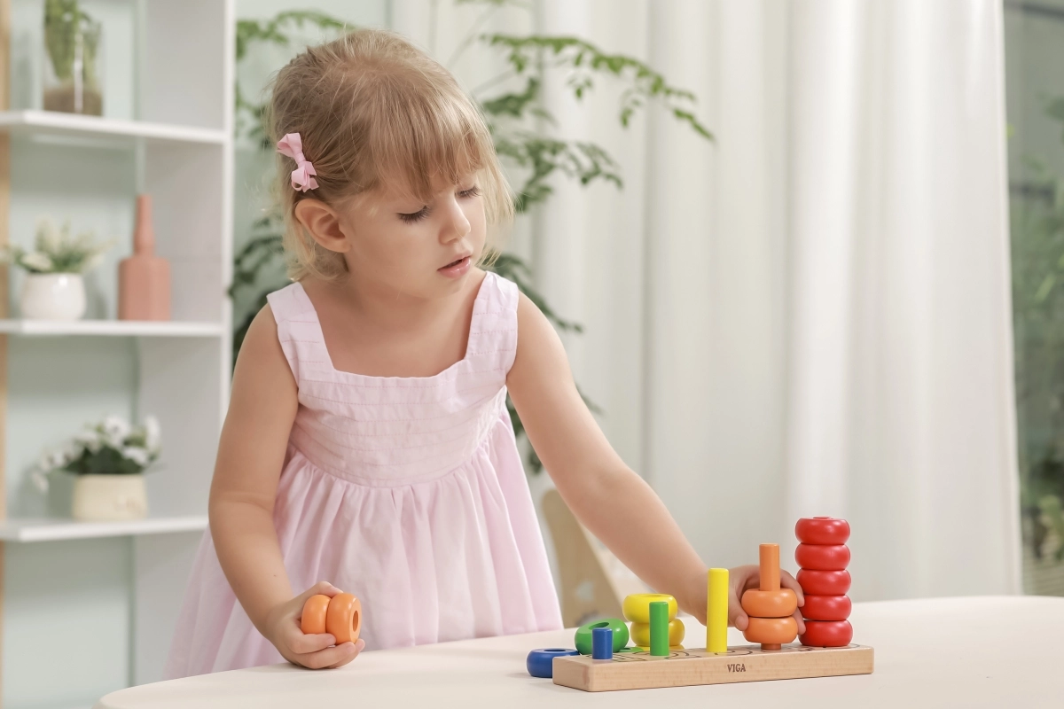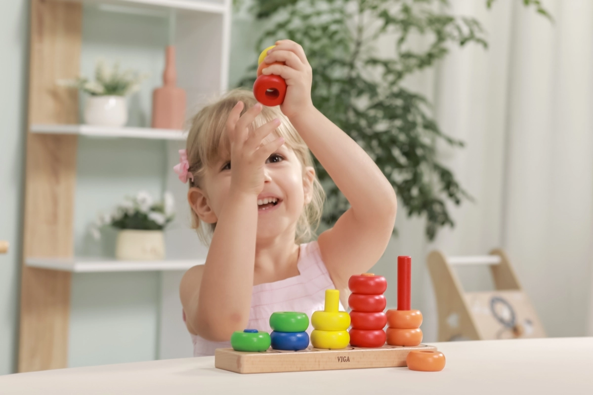 A gyűrűk felfűzése támogatja a mozdulatok pontosságát, a türelmet és a koncentrációt – ideális az óvodás korosztálynak.