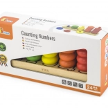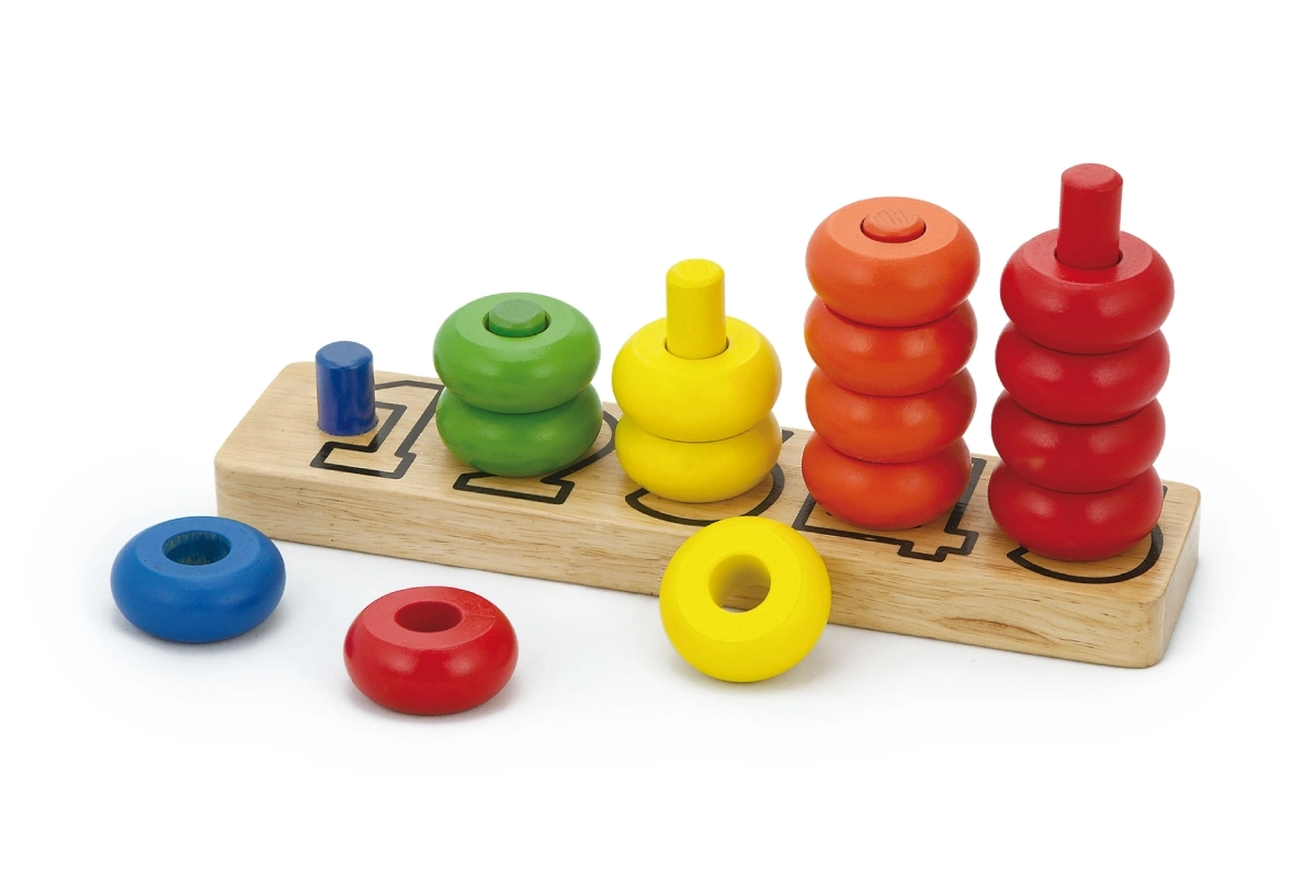 Ez a tartós fa számoló biztonságos és intuitív tanulási lehetőséget kínál a gyerekeknek. A masszív alapon függőleges rudak vannak, amelyekre a gyerekek színes gyűrűket fűznek, szín és mennyiség szerint válogatnak, és gyakorolják az első számtani készségeket. A játék fejleszti a logikus gondolkodást és a koncentrációt.
