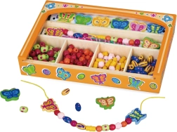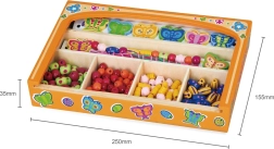 Ez a gazdag fa gyöngykészlet változatos színeket, formákat és méreteket kínál, amelyekkel a gyerekek könnyedén készíthetnek saját karkötőket vagy nyakláncokat. Az áttekinthető tárolás a masszív fa dobozban megkönnyíti a rendszerezést és a többszöri játékot.