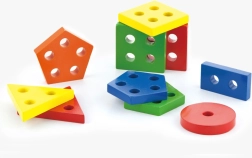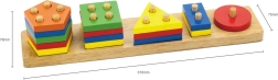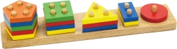 Ez a masszív fa bedugós játék a formák válogatását és a tüskékre való felhelyezést ötvözi. A gyerekek megtanulják megkülönböztetni a színeket és a geometriai formákat, gyakorolják a szem–kéz koordinációt, és ügyesednek az elemek kezelésében. A fa felülete simára csiszolt, a színek élénkek és vonzóak.