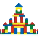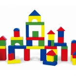 Különböző formájú és méretű fa építőkockák lehetővé teszik a sokféle építményt, mint például a házak, tornyok vagy hidak.
