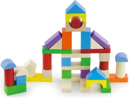 A különböző formájú, színes fa kockák pakolásra és építésre ösztönzik a gyerekeket, így természetes módon fejlesztik a fogást, a szem–kéz koordinációt és a térbeli képzelőerőt.