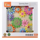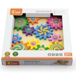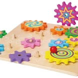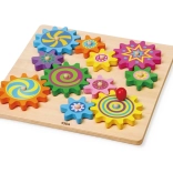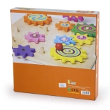 Ez a színes, stabil lapon elhelyezett fa fogaskerék-készlet örömet szerez a kis felfedezőknek. A gyerekek a kerekeket csapokra illesztik, kipróbálják az összekapcsolást, és figyelik, ahogy egy kerék elfordítására mindegyik simán mozgásba lendül. A játék fejleszti a szem–kéz koordinációt, a logikus gondolkodást és az ok-okozati összefüggések megértését.