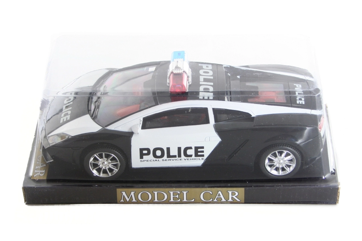 Rendőrautó lendkerék-meghajtással. Az autó mérete kb. 22 × 9 × 7 cm. A csomagolás mérete kb. 26 × 13 × 10 cm. 3+ éves kortól.