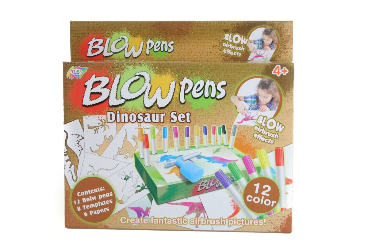 - 12 fújó filctoll, 8 sablon, 6 papír, fújó adapter pumpával, karton talp és filctartó