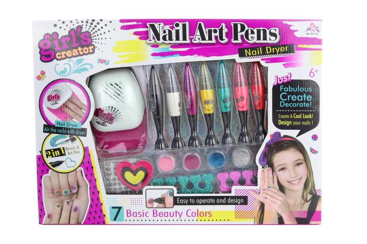 Alkoss otthon különleges körömművészetet a teljes kreatív készlettel kis stylistoknak. A szett tartalmaz 7 színes körömlakkot kétoldalú applikátorral (ecset és toll), egy körömszárítót 2× AAA elemmel, körömreszelőt, ujjelválasztókat, csillámporokat és színes matricákat. Ideális 6 éves kortól.