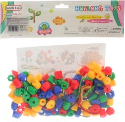 Szórakoztató fűzhető gyöngy készlet a finommotorika és a kreativitás fejlesztésére. Különböző formákat és színeket, valamint színes zsinórokat tartalmaz a fűzéshez. Ideális didaktikai játék 3 éves kortól.