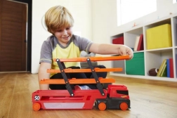 Mega Transporter Hot Wheels 50. évfordulója egy nagy játék teherautó, amely rengeteg szórakozást és csodálatos kalandokat hoz. Hatalmas, hat szinttel bővíthető kapacitása akár 50 kisautót is képes befogadni, és az évfordulóra készített különleges grafikákkal van díszítve.