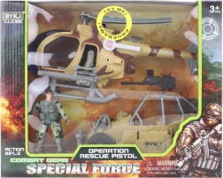 Ez a valósághű katonai készlet rengeteg szórakozást és teret ad a fantáziának. A helikopter gombnyomásra világít és hangot ad, ami fokozza a játékélményt. A készlet része még a páncélozott autó és a katona figura a teljes akciójelenetekhez.