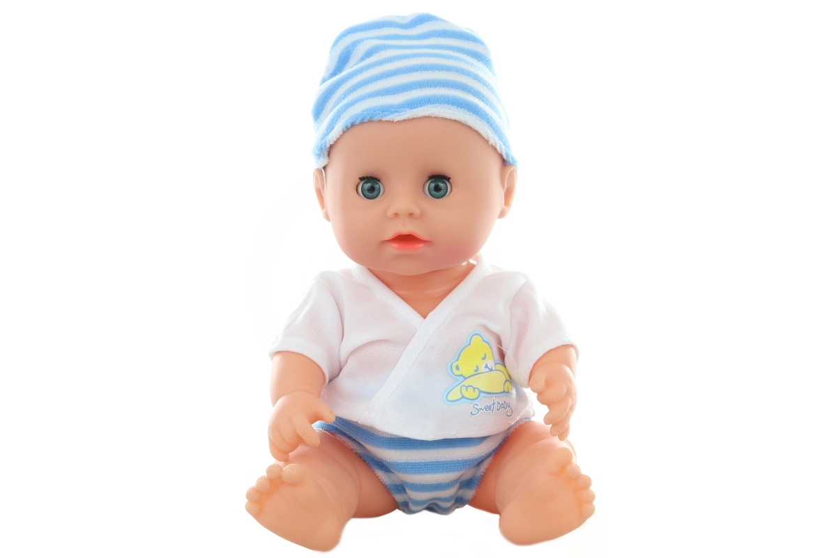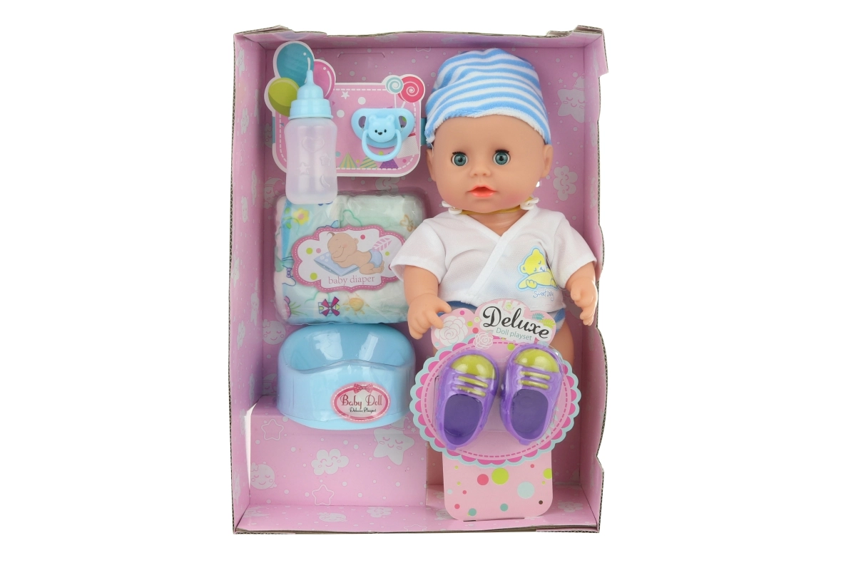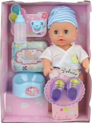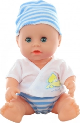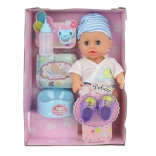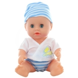 A 30 cm magas, aranyos baba minden kis gondoskodót megörvendeztet. Elem behelyezése után valósághű hangokat ad ki és tud pisilni. A csomag része cipőcske, előke, cumisüveg, tányér és további kiegészítők a mamás-papás játékhoz. Ideális 3 éves kortól.