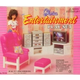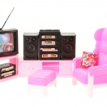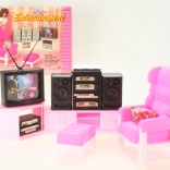 A készlet tartós műanyagból készült, és tartalmaz egy kényelmes fotelt lábtartóval, praktikus, ajtókkal ellátott nappali falat, sarokszekrényt és multimédiás felszerelést. Kompakt méretei megkönnyítik a kezelést és a tárolást.