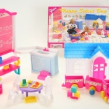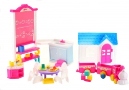 - Gazdag tartozékok: polcos tábla, mosdókagyló, házikó, asztalka, 4 szék, főzőlap, kisvonat 3 kocsival és apró kiegészítők.
