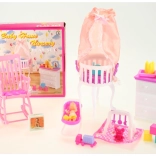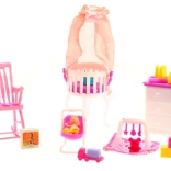 Ez a gazdagon felszerelt szett minden játékot valósághű élménnyé változtat. A gyerekek berendezhetik a saját baba-sarkukat, eltehetik az apróságokat a komódba, a babát elhelyezhetik a baldachinos kiságyba, és ringatózhatnak a stílusos székben. A szett nagyszerűen támogatja a kreatív játékot, a finommotorika fejlesztését és a szerepjátékot.