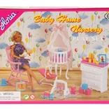 A Glorie márka teljes babaszettje mindent tartalmaz, amire a gyerekszobában szükség lehet a babákkal való játékhoz. Találsz benne komódot fiókkal, baldachinos kiságyat, pihenőszéket, hintaszéket, babagondozási kiegészítőket és magát a babát. Ideális 3 éves kortól a fantázia és a gondoskodó készségek fejlesztéséhez.