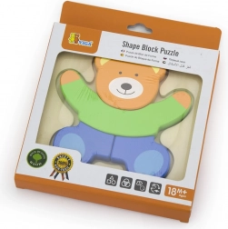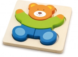 A puzzle 4 darabot tartalmaz, amelyek a fa alapon összeállítva egy medve képet alkotnak. Ezek a darabok kényelmesen beleférnek a kimetszett formákba az optimális összeszereléshez.