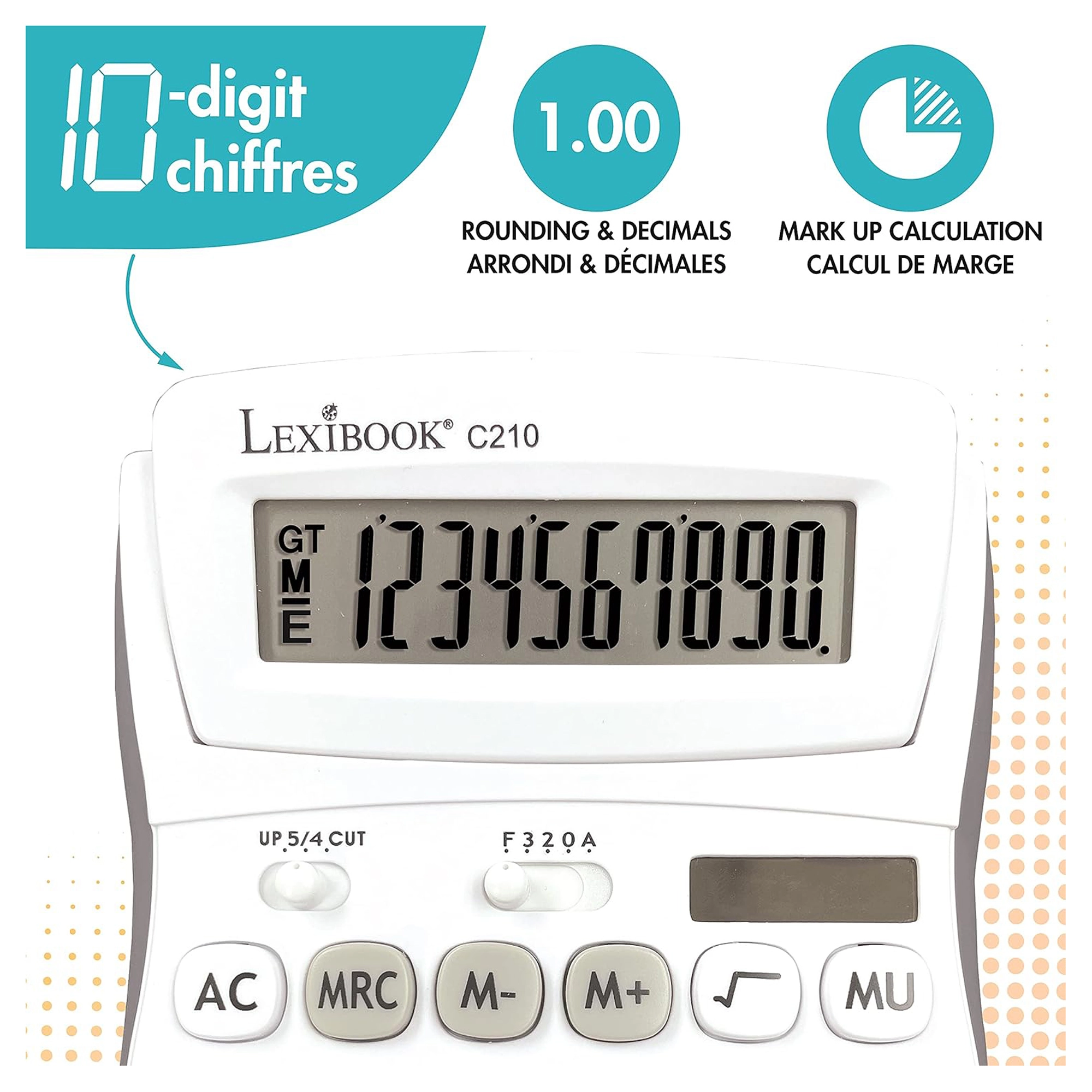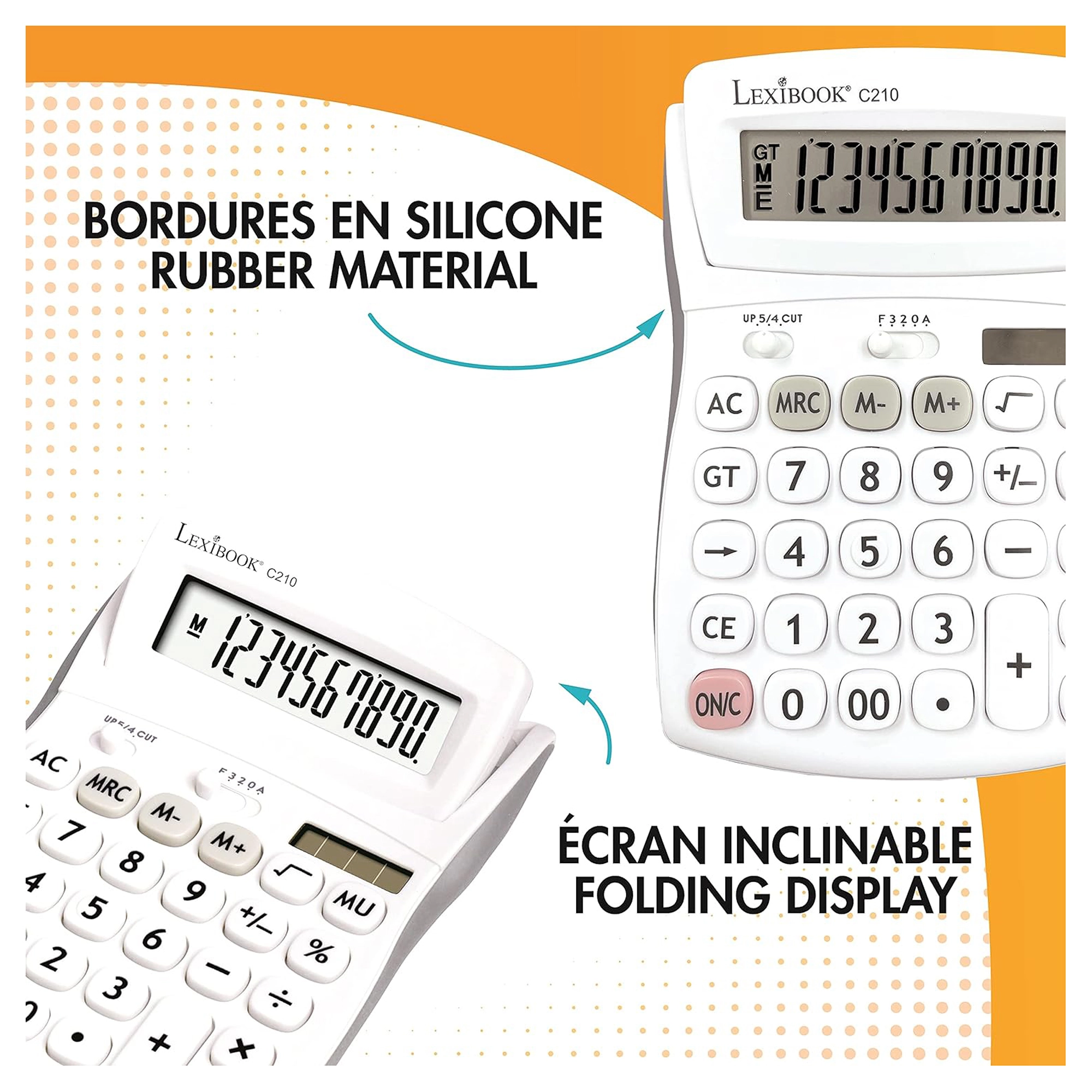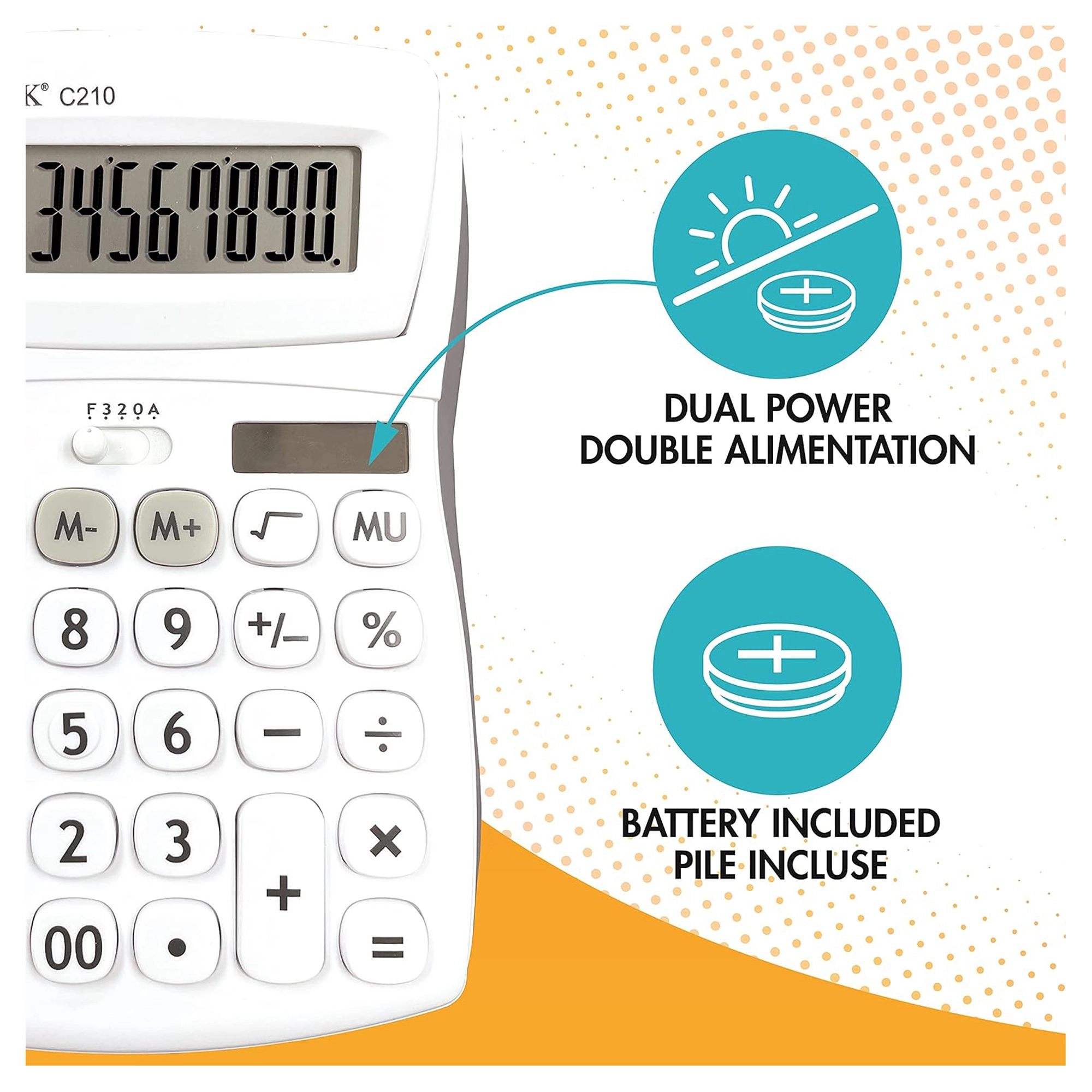 Univerzális asztali számológép 10 számjegyes, felnyitható kijelzővel, nagy, gumírozott gombokkal és kettős táplálással (napelem + AG10 elem). Alap- és haladó funkciókat kínál, beleértve a 3 szám memóriát, a százalékszámítást, a négyzetgyököt, a árrés számítást és a javítógombot. Ideális irodába, iskolába és otthonra.