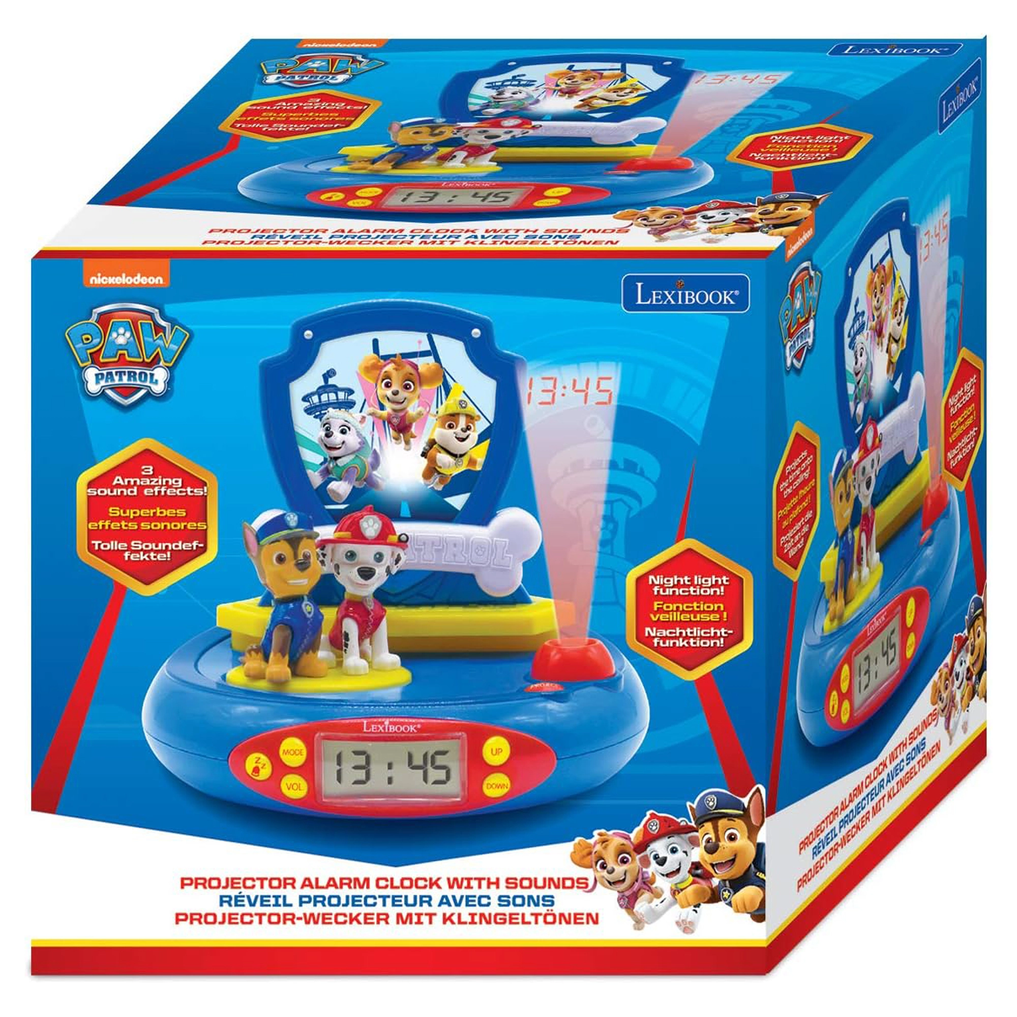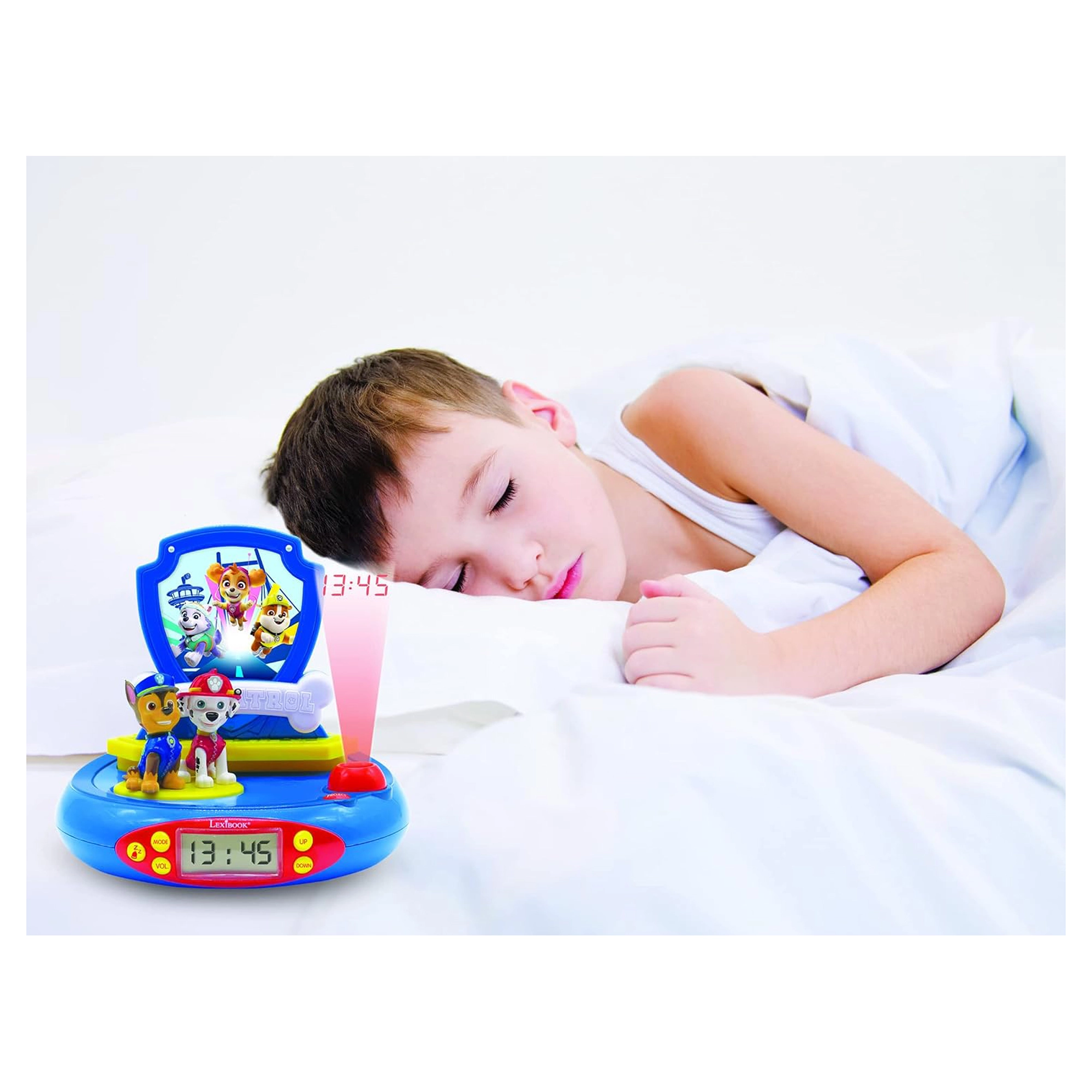 A gyerekek a "PROJECT" gomb megnyomásával vetíthetik az időt a plafonra, ami ideális az éjszakai használatra. Ez az ébresztőóra egy kellemes éjszakai fény funkcióval is rendelkezik, ami automatikusan kikapcsol 15 perc múlva. Chase és Marshall, a Mancs Őrjárat szereplői, játékos hangulatot adnak a dekorációnak.