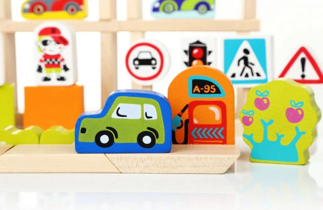 A városközlekedési építőkészlet lenyűgözi a gyerekeket a különböző színű fa blokkok kombinációival, amelyek segítségével egy nyüzsgő várost állíthatnak össze, tele autókkal, jelzőlámpákkal és benzinkutakkal. Kiválóan fejleszti a szemzoros motoros képességeket, a kreatív gondolkodást és a logikai készségeket.