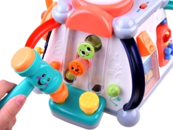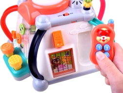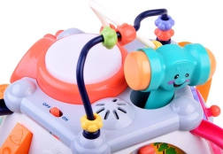 Kormány duda- és motorhanggal, fogaskerekek dallamokkal és fényekkel, kihúzható mikrofon hangerőszabályzóval, kalapácsos oldal golyóalagúttal, telefon gombokkal és képcserével, világító dob, gyöngylabirintusok
