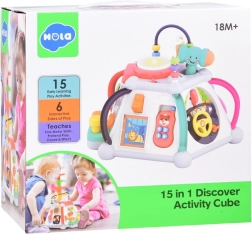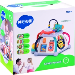 A HOLA multikocka gazdag tevékenységpalettát kínál a legkisebbeknek. Minden oldal más-más játékot rejt – az autóvezetéstől a fogaskerekeken át (fényekkel és dallamokkal) egészen a mikrofonig egy megvilágított „tévével”. A felső rész gyöngylabirintusokat, világító dobot és a kalapács tárolóhelyét rejti. Minden a kis gyerekkézhez és a biztonságos felfedezéshez lett tervezve.