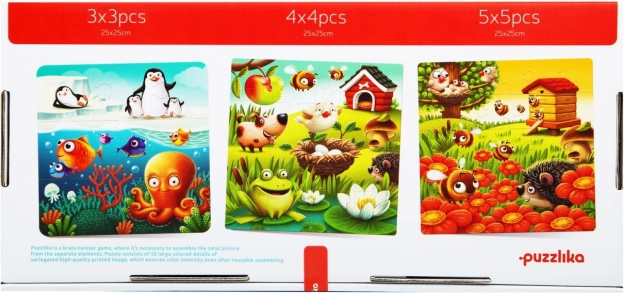 Fedezd fel a játékos tanulást a Puzzlika kedvenc állatok 3 az 1-ben kirakóval. A csomag összesen 50 nagy darabot tartalmaz, amelyekből a gyerekek 3 különálló, 25 × 25 cm-es képet rakhatnak ki különböző nehézségi szintekkel (3×3, 4×4, 5×5). A színes állatmotívumok és az élénk színek vonzóvá és motiválóvá teszik a kirakást az óvodás korosztály számára.