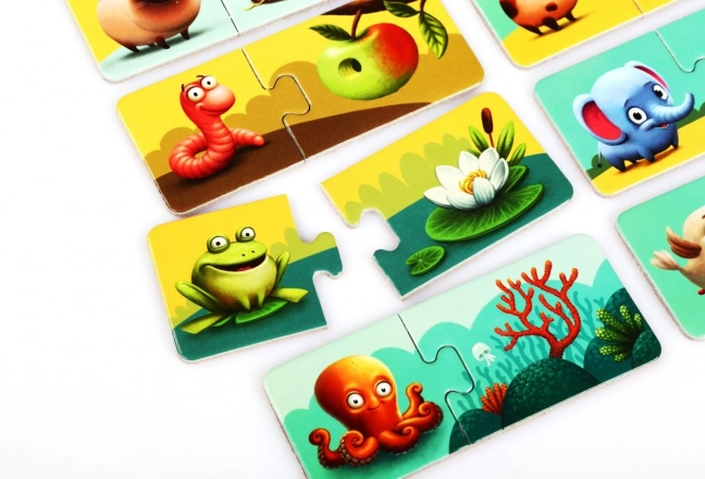 A készlet 20 erős darabot tartalmaz, amelyek 10 tematikus párt alkotnak. A képek élénkek és színesek, hogy fenntartsák a figyelmet és motiválják a felfedezést. A minőségi, környezetbarát karton fényes felülettel tartós, és nedves kendővel letörölhető.