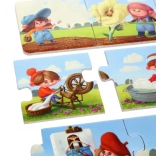 A Puzzlika Farmerkészítés történetkirakó 2 éves kortól játékos tanulást kínál: a gyapot betakarításától egészen a kész farmernadrágig. A nagy és erős elemek ideálisak a kis kezekhez, a világos illusztrációk pedig segítenek megérteni az egyes lépések egymásra épülését.
