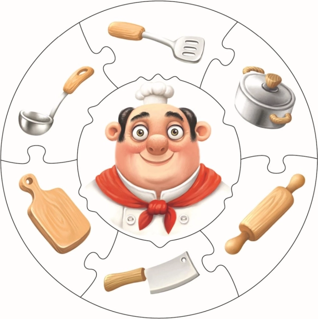 A szakácsot és eszközeit (fakanál, lábas, nyújtófa) ábrázoló illusztráció segíti a logika fejlődését és a mindennapi tevékenységek megismerését.