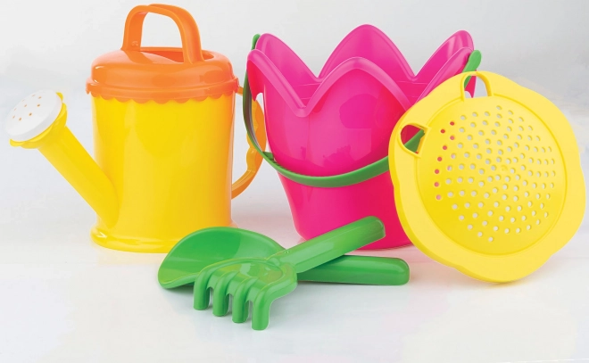 - Komplett felszerelés: vödör – tulipán, 1,2 l-es locsolókanna, szita, lapát, gereblye