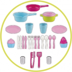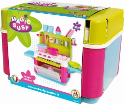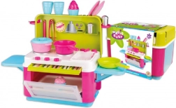 Ez a pultos kiskonyha ideális utazáshoz és kisebb gyerekszobákba. A két oldalsó, teherbíró és levehető lapnak köszönhetően több helyet biztosít a játékhoz, és könnyen szállítható. Tartozik hozzá sütő tepsivel, főzőlap, mosogató csappal és gazdag edénykészlet – minden a valósághű főzős játékhoz.