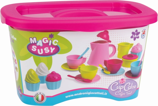 Az Androni márka stílusos kávés készlete bármely gyerekkonyhát kis kávézóvá varázsol. A szett mindent tartalmaz a baristás játékhoz – a kancsótól és csészéktől a bájos cupcake-ekig – és minőségi, erős és rugalmas műanyagból készül Olaszországban. A 24 darabos összeállításnak, a praktikus fedeles tárolódoboznak és a biztonságos kivitelnek köszönhetően ideális 18 hónapos kortól, sőt óvodákba is.