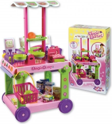 - Guruló kocsi levehető napellenzővel, oldalsó kihúzható pult, 4 kosár fogantyúval, pénztárgép érmékkel, mérleg tálkákkal, 12 db gyümölcs és zöldség, 8 dobozos áru