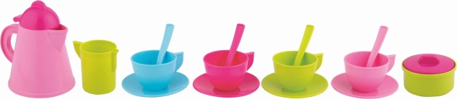 Kancsó, 4 csésze csészealjjal, 4 kiskanál, tetős cukortartó és tejszki – mind élénk színekben, hogy még szórakoztatóbb legyen a kávézós játék.
