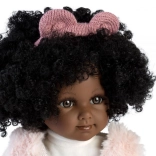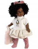 Fedezze fel a bájos Llorens Zuri 35 cm babát – elegáns, sötétebb bőrtónus, dús, göndör haj rózsaszín masnival és stílusos öltözet puha anyagokból. Karok, lábak és fej finom vinilből, puha textil test a kényelmes ölelgetéshez. Spanyolországi kézműves gyártás és EU-szabványoknak megfelelő biztonság a minőségi, biztonságos játékért.