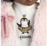 Kombinált ruha, „bolyhos” kardigán és masnis zoknik kellemes textíliákból a kényelmes játékért és stílusos megjelenésért.