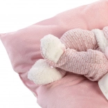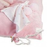 Tartalmaz egy fehér lánccal ellátott cumit, valamint egy puha rózsaszín takarót a nagyobb játékélményért.