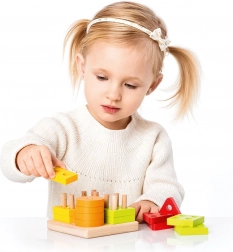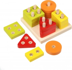 Színes körök, négyzetek, háromszögek és téglalapok nyílásokkal, melyeket az alap pálcáira kell ráhelyezni. A gyerekek így természetesen válogatnak forma és szín szerint, és gyakorolják a logikus gondolkodást.
