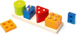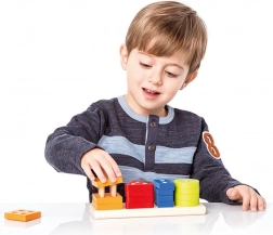 Ez a minőségi, fából készült alakválogató 16 színes, geometriai formát kínál, amelyeket a téglalap alakú alap tüskéire lehet felfűzni. Játék közben a gyerekek megtanulják felismerni a színeket és a formákat, különféle kombinációkat próbálnak ki, és természetes módon gyakorolják a koordinációt és a türelmet.