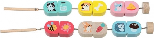 Az állatok és ételeik párosítása és fűzése erősíti az ujjakat, a koncentrációt, valamint a feladatmegoldó képességet játékos formában.